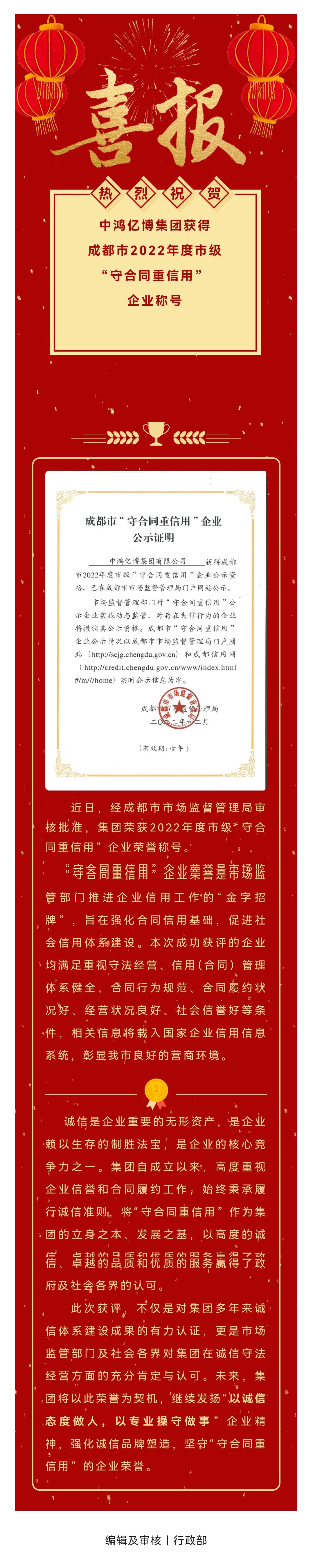 億博動態(tài)丨恭喜集團(tuán)榮獲成都市2022年度市級“守合同重信用“企業(yè)稱號