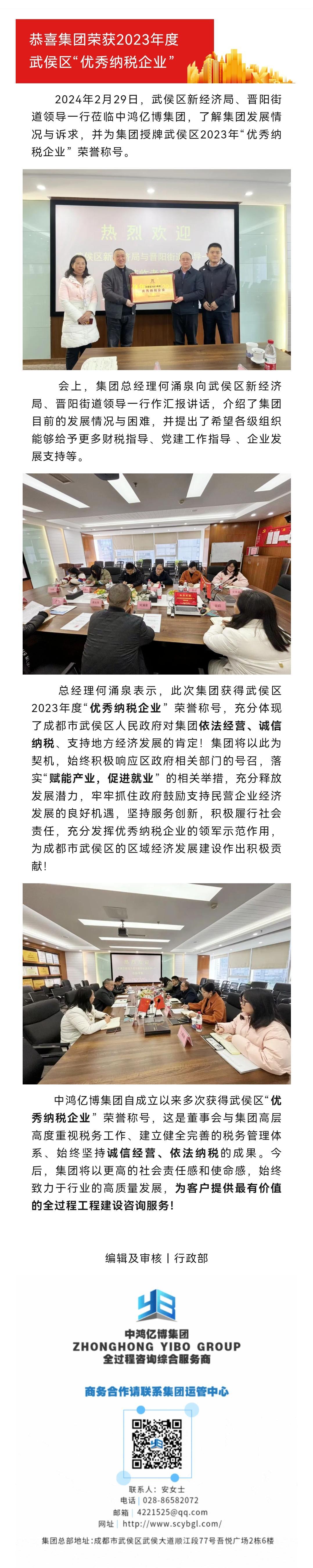 億博動(dòng)態(tài)丨誠信經(jīng)營 依法納稅—恭喜集團(tuán)榮獲2023年度武侯區(qū)“優(yōu)秀納稅企業(yè)”稱號