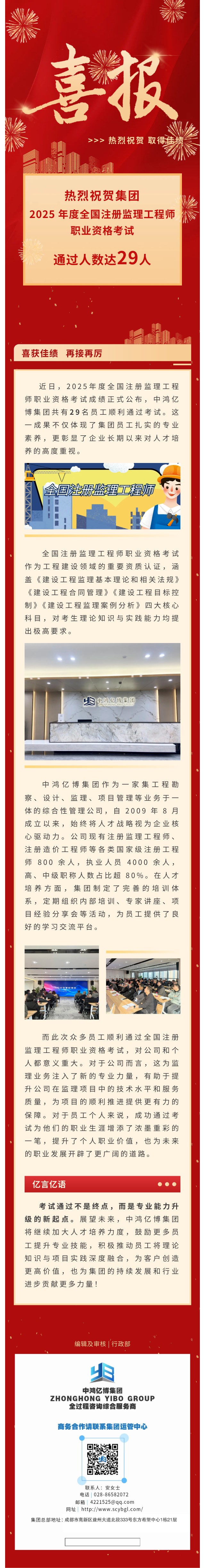 喜訊!祝賀29位億博人順利通過2025年度全國注冊監(jiān)理工程師職業(yè)資格考試!
