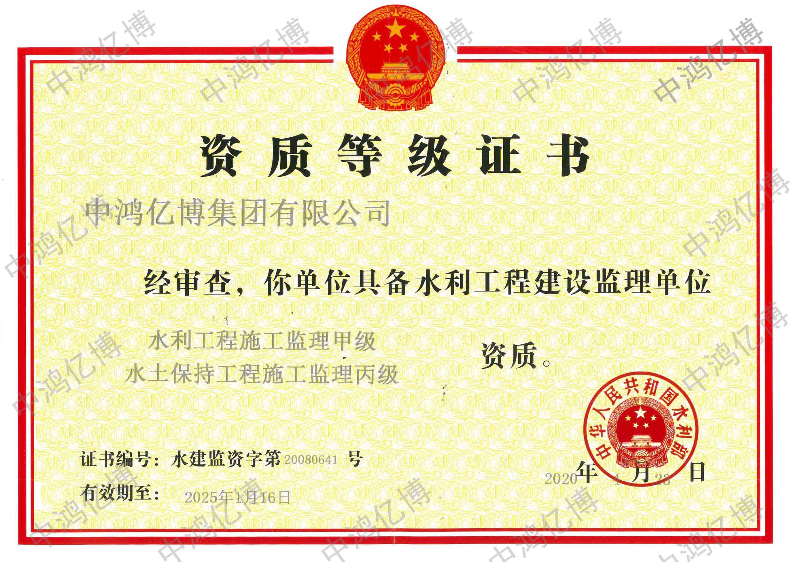 中鴻億博集團(tuán)在集團(tuán)董事會(huì)的正確領(lǐng)導(dǎo)下、在全體員工的共同努力下、在社會(huì)各界朋友的關(guān)心與支持下,集團(tuán)終于守得云開見月明,成功取得水利部頒發(fā)的水利工程施工監(jiān)理甲級(jí)、水土保持工程施工監(jiān)理丙級(jí)資質(zhì);這是億博集團(tuán)發(fā)展史上的又一個(gè)重要的里程碑事件,給集團(tuán)未來的長(zhǎng)足發(fā)展帶來了巨大的生存和發(fā)展空間,億博集團(tuán)全體員工一定會(huì)不負(fù)眾望和社會(huì)各界朋友一起凝心聚力,一如既往地為我們的客戶提供高水平、高質(zhì)量、最優(yōu)質(zhì)的監(jiān)理服務(wù)工作,在水利工程施工監(jiān)理業(yè)務(wù)方面大放異彩,為集團(tuán)公司的未來發(fā)展再譜新篇。