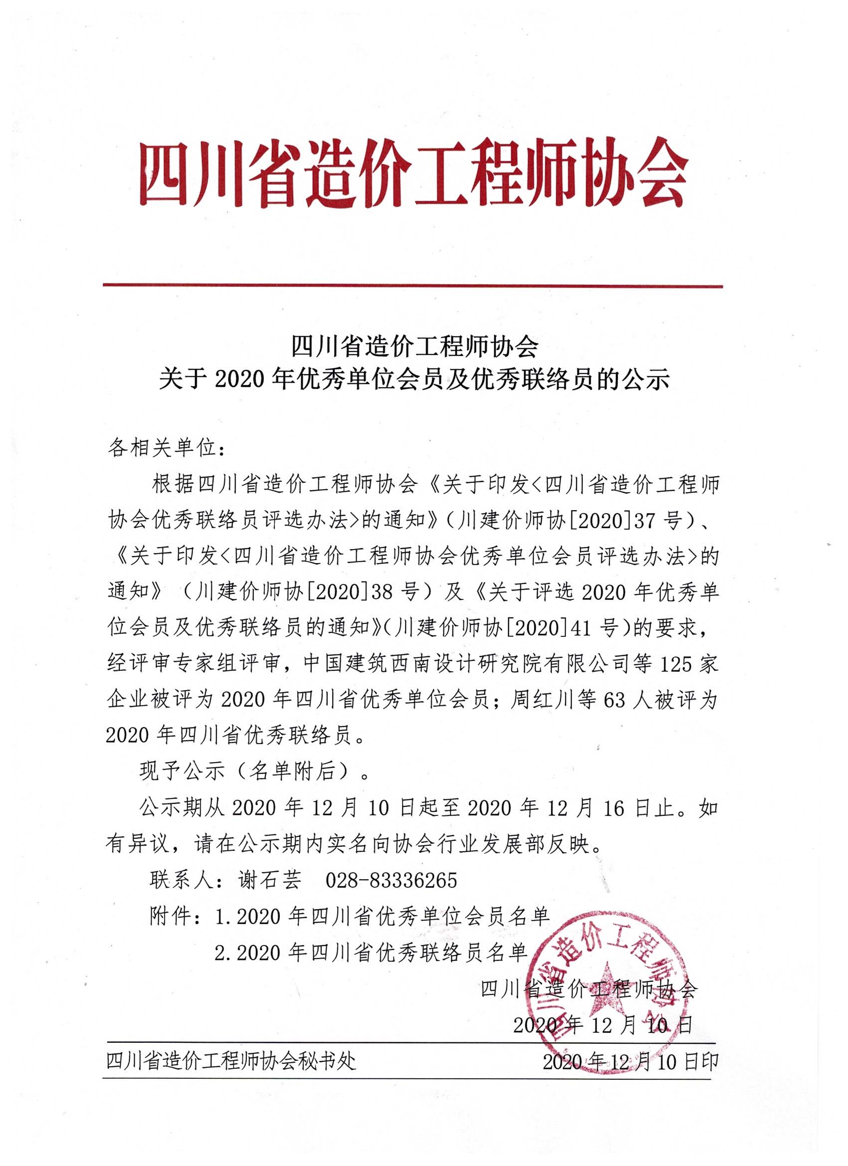 12月10日,四川省造價(jià)工程師協(xié)會(huì)發(fā)布了《關(guān)于印發(fā)<四川省造價(jià)工程師協(xié)會(huì)優(yōu)秀聯(lián)絡(luò)員評(píng)選辦法>的通知》(川建價(jià)師協(xié)[2020]37號(hào))《關(guān)于印發(fā)<四川省造價(jià)工程師協(xié)會(huì)優(yōu)秀單位會(huì)員評(píng)選辦法>的通知》(川建價(jià)師協(xié)[2020]38號(hào))及《關(guān)于評(píng)選2020年優(yōu)秀單位會(huì)員及優(yōu)秀聯(lián)絡(luò)員的通知》(川建價(jià)師協(xié)[2020]41號(hào)),經(jīng)評(píng)審專家組評(píng)審,中鴻億博集團(tuán)有限公司等125家企業(yè)被評(píng)為2020年四川省優(yōu)秀單位會(huì)員。