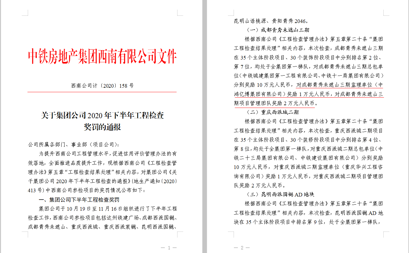 在中鐵房地產(chǎn)集團有限公司2020年下半年度第三方工程檢查中,青秀未遮山三期(閱山府)項目主體階段綜合測評成績榮獲中鐵集團第二名(35個項目參檢)、裝飾階段綜合測評成績榮獲中鐵集團第七名(30個項目參檢),均處于中鐵集團第一梯隊。集團公司青秀未遮山三期項目監(jiān)理部受到中鐵房地產(chǎn)集團西南有限公司通報嘉獎及現(xiàn)金獎勵1萬元人民幣。