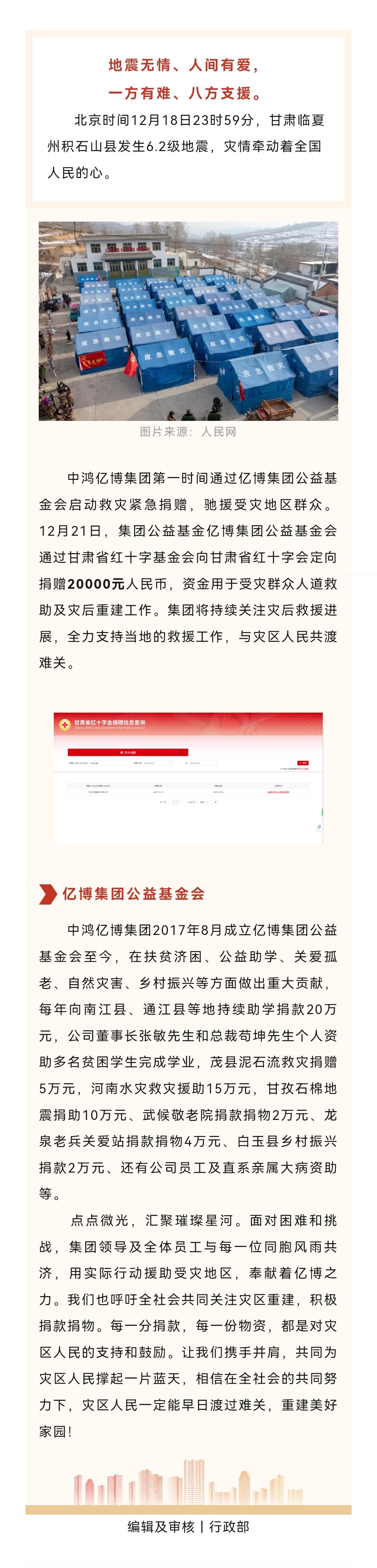 億博公益丨中鴻億博集團向甘肅積石山縣6.2級地震災區(qū)捐款